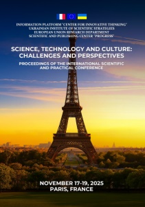 INFORMATION PLATFORM "CENTER FOR INNOVATIVE THINKING" UKRAINIAN INSTITUTE OF SCIENTIFIC STRATEGIES EUROPEAN UNION RESEARCH DEPARTMENT SCIENTIFIC AND PUBLISHING CENTER "PROGRESS" SCIENCE, TECHNOLOGY AND CULTURE: CHALLENGES AND PERSPECTIVES PROCEEDINGS OF THE INTERNATIONAL SCIENTIFIC AND PRACTICAL CONFERENCE NOVEMBER 17-19, 2025 PARIS, FRANCE