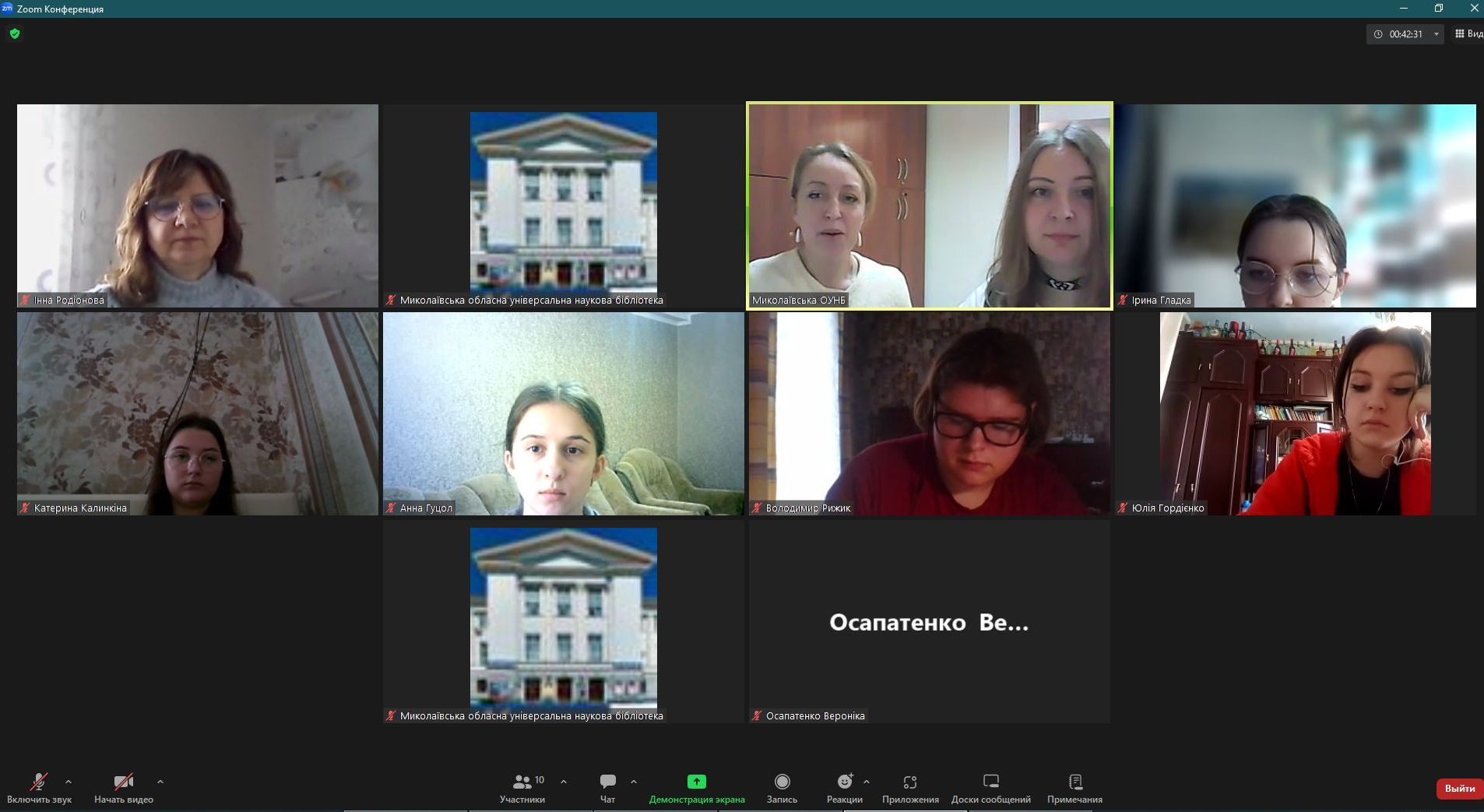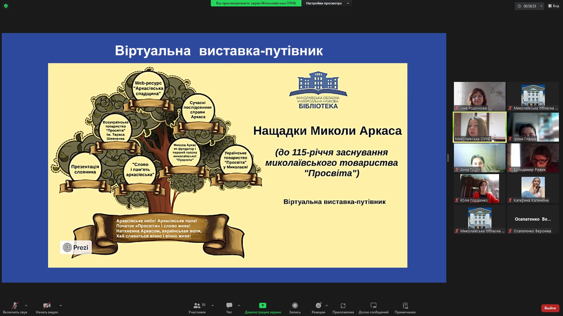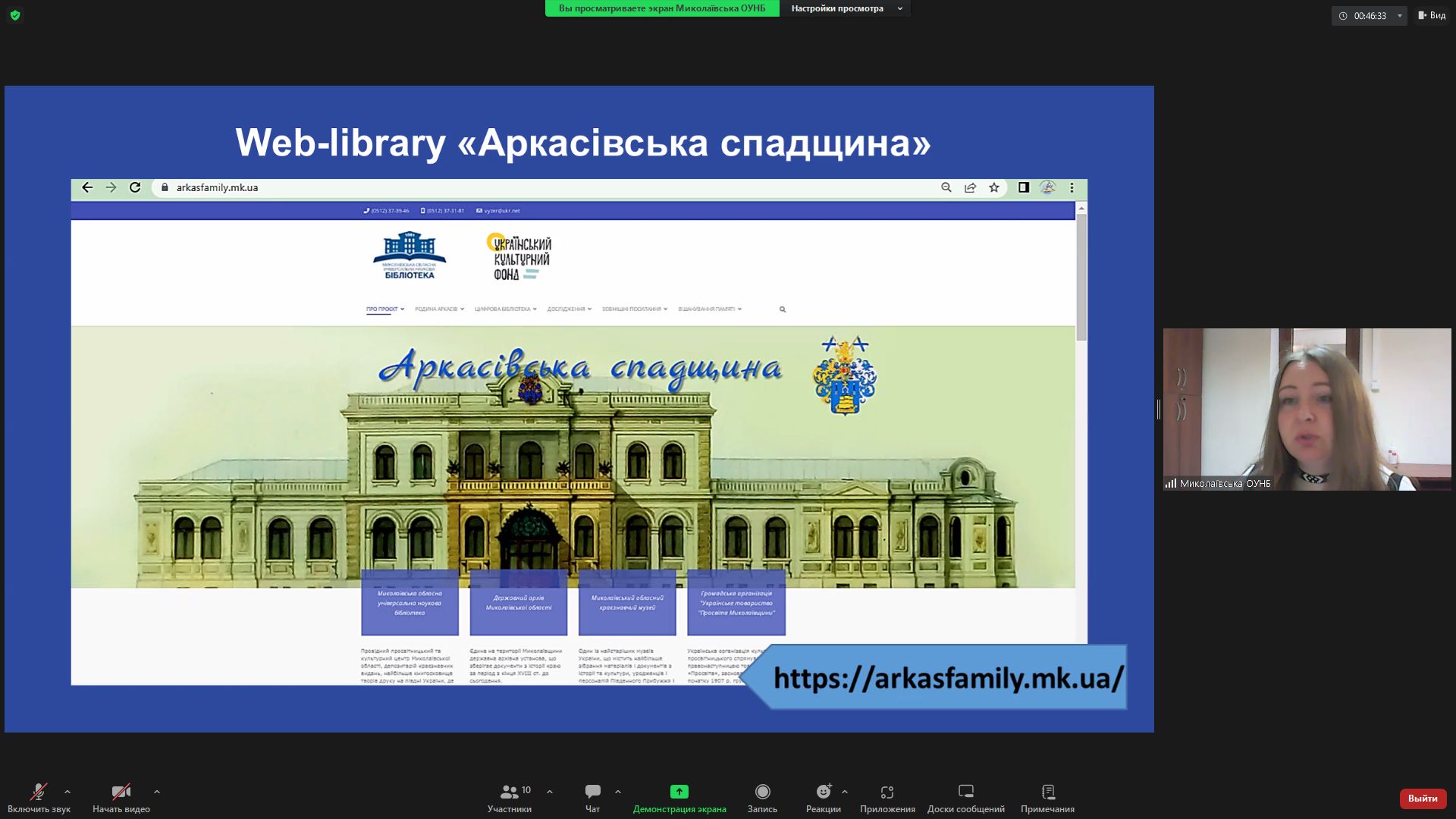 Увазі аудиторії також були представлені краєзнавчі віртуальні продукти Миколаївська обласна універсальна наукова бібліотека – комплексний інформаційний електронний ресурс web-library «Аркасівська спадщина» https://arkasfamily.mk.ua/ , віртуальна виставка «Нащадки Миколи Аркаса» http://surl.li/lvcyf та бібліографічний покажчик «Слово і пам’ять аркасівська» http://surl.li/qmhtl.