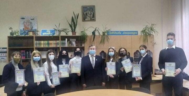 Під звучання уривку з опери «Катерина» (слова Тараса Шевченка, музика Миколи Аркаса), Підгородинська Поліна, 7(11)-Б, та Чорний Михайло, 5(9)-Б, (переможці предметних учнівських олімпіад) поклали квіти до скульптурної фігури, яка встановлена в центральній рекреації приміщення закладу у 1993 році.