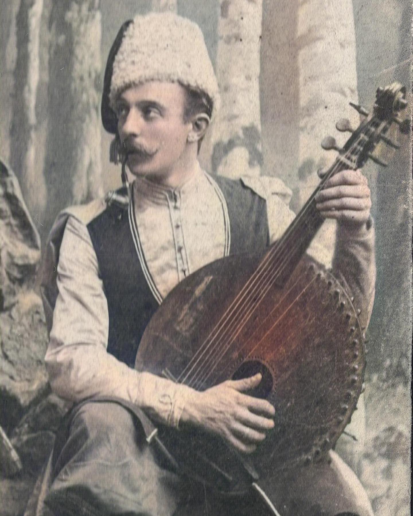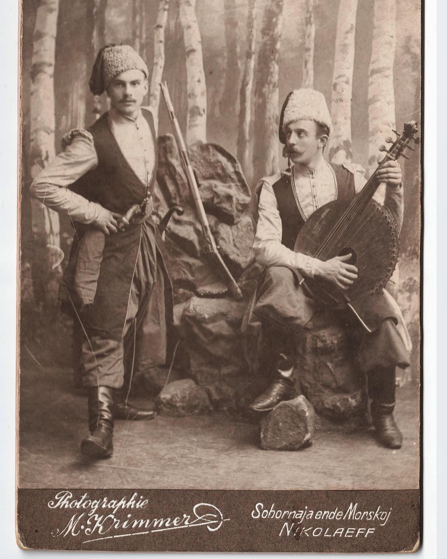 На цьому фото початку ХХ ст. він (праворуч) у театральному козацькому костюмі з бандурою у руках разом з колегою по гуртку зображує сцену з опери «Запорожець за Дунаєм» С. С. Гулака-Артемовського у постановці миколаївської «Просвіти», яку ставили в Херсонському театрі та миколаївському театрі Якова Шеффера.