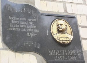 9 листопада 1992 р. у м. Миколаєві на вул. Адміральській, де знаходився будинок Аркасів, за ініціативою Миколаївського обласного відділення Українського фонду культури та за підтримки управління культури облдержадміністрації та товариства охорони пам’яток встановлено пам'ятний знак М. М. Аркасу – стелу з барельєфом Миколи Аркаса (автор В. Федорук, О. Бондаренко). З метою вшанування пам'яті славетного земляка тут щороку у день народження М.М. Аркаса проводяться благодійні акції, урочистості та покладання квітів.